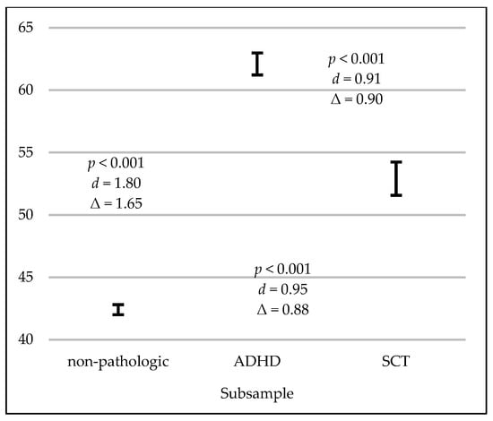 Regarding the statistically significant differences between the non-pathologic group and the SCT group, first, a small effect size was detected in the subscale for Emotional Self-Regulation and a medium effect size for Self-Motivation. Comparing the clinical groups (ADHD and SCT) with each other, significant differences were found with a large effect size for Emotional Self-Regulation and a medium effect size for Self-Motivation. As in the investigations of Barkley [21], Burns and Becker [49], the emotional and motivational control problems of the SCT group were statistically lower than those of the ADHD group, in both cases coming closer to the score of the non-pathologic group. As in Burns and Becker’s publication [49], emotional and motivational management difficulties were the least relevant in the SCT group compared to other executive domains.