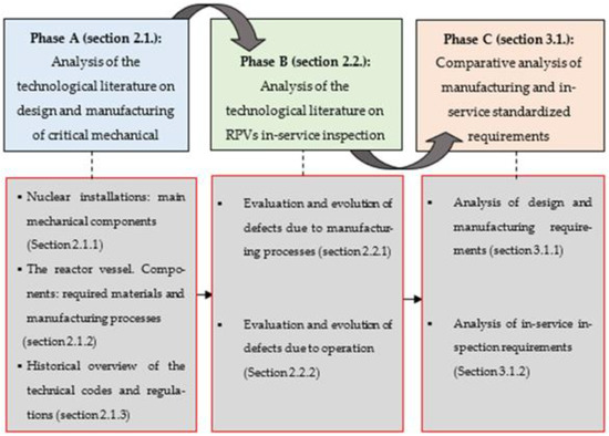 The methodology of the performed analysis has been divided into 3 stages or phases (Figure 1). In the Phase A, an analysis of the technological literature on RPV design and manufacturing is performed. In the Phase B, an analysis of the technological literature on RPVs in-service inspection is carried out. Finally, in the Phase C a comparative analysis of manufacturing and in-service standardized requirements is presented.