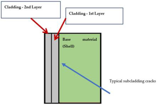 Distribution of cladding layers and location of typical sub-cladding cracks in the shell material.