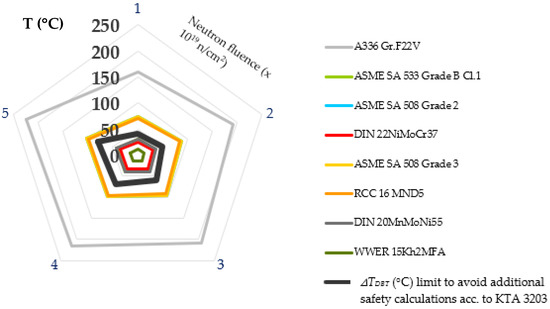 - Rodríguez-Prieto, A.; Camacho, A.M.; Sebastián, M.A. Selection of candidate materials for reactor pressure vessels using irradiation embrittlement prediction models and a stringency level methodology. Proc. Inst. Mech. Eng. Part L 2019, 233, 965–976. [Google Scholar]