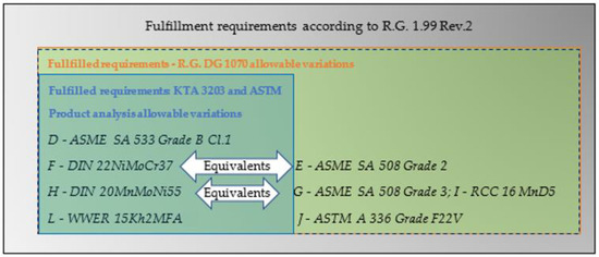 The steels used in the construction of RPVs are low-alloy steels where the percentage of all the elements is below 5%. The low-alloy steels are cladded with an austenitic stainless steel. Strict control of impurities is necessary in these steels, since sulfur has a negative influence on resilience, while copper and phosphorus influence susceptibility to brittleness by neutron irradiation. In the case of RPVs, the shell material is cladded with austenitic stainless steel to protect the vessel from corrosion. A suitable cladding process and material selection are crucial to avoid a pernicious effect like the hydrogenation. The materials to be used in the manufacture of nuclear reactors are addressed by internationally recognized codes, standards and specifications. Materials are not registered in the codes and standards, while there is not a wide experimental database of its properties, behavior, manufacture, processing and composition. Allowed materials must be in accordance with the corresponding design and manufacturing codes. The selected materials must withstand the effects of corrosion and must have sufficient strength to be used at the design temperature and pressure. An adequate selection of materials will ensure low initial costs (e.g., Capital Expenditures—CAPEX) as well as operational and maintenance costs (e.g., Operational Expenditures—OPEX). For example, the ASME B&PV code [25] does not recommend or suggest any type of material for any specific application. Instead, it indicates what materials are allowed and their requirements. Materials to be used in vessel construction are selected jointly by the equipment designer and the process manager. In all cases, some general features that the materials to be used in the manufacture of nuclear reactors must have are [23]: