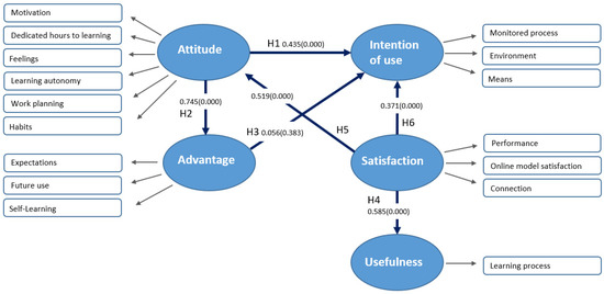 Results show a significant positive relationship between attitude and intention of use (H1: β = 0.435, p < 0.000), attitude and advantages (H2: β = 0.745, p < 0.000), satisfaction and usefulness (H4: β = 0.585, p < 0.000), satisfaction and attitude (H5: β = 0.519, p < 0.000), and satisfaction and intention (H6: β = 0.371, p < 0.000). The hypothesis H3, which posed the relationship between students’ intention to use online systems and students’ perceived advantages, could not be supported (H3: β = 0.056, p < 0373) at the 95% confidence level.