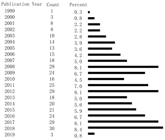 Based on the chart analysis of the year of publication, it can be seen that, since 1999, the topic of internationalization of industrial clusters has been studied, but it was not until 2008 that the boom of publications relating to international clusters really started as a result of the global financial crisis. Moreover, as can be seen from the number of publications per year, shown in Figure 2, the research trend of cluster internationalization is increasing day by day, indicating that the research in this field not only has a foundation, but also an infinite prospect.