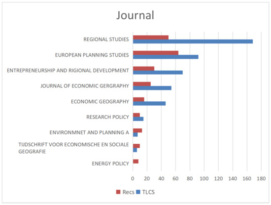 In order to analyze the journals more effectively, we used TLCS (total local citation score), TGCS (total global citation score), and Recs (records) from Histcite as the analysis criteria. Since the gap between the journals’ TGCS data and the other two data points was too large, it is not reflected on the chart for purposes of clarity. Similarly, the TLCS data were ranked in descending order to create Figure 3. It can be seen that the highest numbers of local citations and publications were found to relate to Regional Studies. This further reflects the close connection between clusters and regional innovation systems, such as the use of economies of scale and scope of economies, transaction costs, competitive advantages, and innovation German theory to establish a regional innovation network theory system to explain the industrial agglomeration and the development of regional innovation networks in new production areas. At the same time, several scholars have described industrial cluster theory as a new type of regional economic development theory, following the theory of gradient shifts, growth poles, and regional production complexity [35].