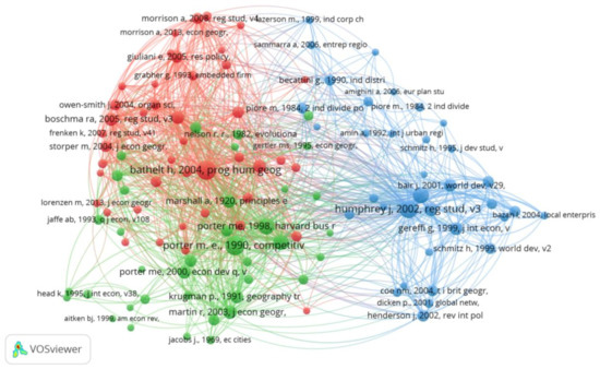 According to the analysis of the data, Bathelt H et al. [36], Porter ME [1], and Humphrey and Schmitz [37] were the top three co-cited documents. The number of citations and total links were (147, 1538), (141, 1351), and (117, 1210), respectively. It can be seen from the network patterns shown in Figure 4 that the circles corresponding to these three documents were the first among the three clusters (blue, green and red). Therefore, it can be affirmed that these three publications laid the foundation for the development of different research topics in the later internationalization of clusters. Subsequently, the number of references and total links to Krugman P [13], Marshall A [9], Jaffe AB et al. [38], Allen J Scott [2], Head K et al. [39], Jacobs J [40], and Porter M [15] were also ranked in the top 10, which jointly constructed the knowledge framework for research in the field of cluster internationalization. Table 1 shows the top 10 most frequently cited articles on cluster internationalization.