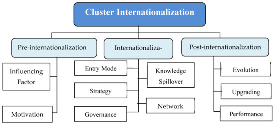 After summarizing the synonyms of the high-frequency words obtained from the Citespace analysis, nine clusters’ keywords were extracted: dynamic mechanism, strategy, entry mode, network, structure and dynamic capability, knowledge spillover, governance, evolution, and upgrading performance. The theme was further sublimated to obtain the integrated research framework of cluster internationalization (Figure 7). The framework shows the whole process, including the three stages—pre-internationlization, internationalization, and post-internationalization, which are the main interests of the study. Due to space constraints, I will only discuss one important research topic at each stage.