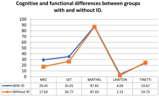 In Figure 1, which represents the cognitive and functional differences between groups with and without ID, it is observed how the group with ID obtained higher scores in the cognitive section, as well as in the Lawton scale. In the rest of the functional tests, hardly any differences were seen between the two groups.