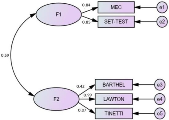 Figure 2 shows the result of the analysis carried out with structural equations by the maximum likelihood method, which confirmed the suitability of the model composed of the constructs contemplated in the present study. The analysis showed a good correlation (r = 0.59) between the cognitive variables and the functional variables.