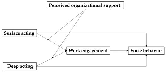 Perceived organizational support is the degree to which employees perceive that the organization values their contributions and cares about their well-being at work [53]. Employees experience a range of positive emotions due to the organization’s commitment to them [54]. This positive emotion can help restore employees’ emotional resources during emotional labor [55]. Previous studies have found that high perceived organizational support promotes employees’ proactive behavior [56], work engagement [57] and job satisfaction [58]. Organizational support is an important external resource for employees. The acquisition of these resources partially offsets resource depletion due to emotional labor and contributes to emotional recovery, thus moderating the relationship between emotional labor and outcome variables [49]. Previous studies have also shown that perceived organizational support can effectively curb the accumulation of negative emotions and minimize the gap between employees’ real emotions and the emotions required for work, thus reducing employees’ emotional dissonance [59]. It can be inferred that when employees’ perceived organizational support is high, the negative impact of surface acting on work engagement will be weakened, while the positive impact of deep acting on work engagement will be enhanced. According to conservation of resources theory, when employees gradually lose energy due to continuous efforts while working, the lack of appropriate internal resources or external resources will lead them to job burnout [23]. However, external resources, such as perceived organizational support, can reduce the stress and resource depletion caused by surface acting and therefore lower the negative impact of surface acting on work engagement. This supplementation of external resources can increase employees’ resources, thereby promoting the positive impact of deep acting on work engagement. Thus, perceived organizational support can strengthen the positive relationship of deep acting on work engagement and weaken the negative relationship of surface acting on work engagement. Figure 1 shows the proposed model.