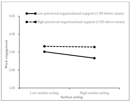 Perceived organizational support moderates the negative relationship between surface acting and work engagement in that the higher the perceived organizational support is, the weaker the negative relationship is between surface acting and work engagement.