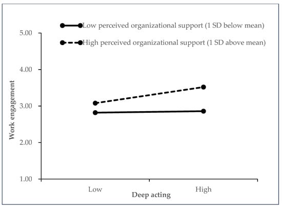 Perceived organizational support moderates the positive relationship between deep acting and work engagement in that the higher the perceived organizational support is, the stronger the positive relationship is between deep acting and work engagement.