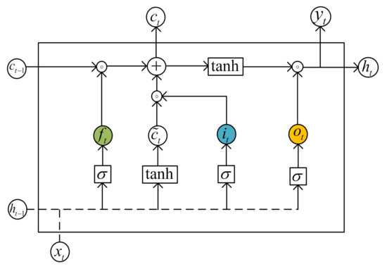 The tanh layer will create a new candidate state vector ct′. The forgetting gate ft determines what information to discard and retain from the cell state ct−1 of the previous time step. The input gate it determines how to update the candidate state vector. After the cell state is updated, the output gate ot decides how to filter the new state vector ct into output information ht.