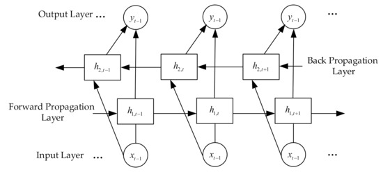 The bidirectional long and short-term memory (Bi-LSTM) network is derived from the bidirectional cyclic neural network [19]. Its main feature is to increase the learning function of the neural network for future information, thereby overcoming the defect that the unidirectional LSTM network can only process historical information. The Bi-LSTM mainly splits the ordinary LSTM into two directions, but the two LSTMs are connected to the same output layer. Such a structure can provide complete upper and lower sequence information for the input sequence of the output layer. Using a Bi-LSTM network to model bus load forecasting is to input historical data into a forward LSTM network and a reverse LSTM network at the same time, so as to capture a complete time series global information. The Bi-LSTM neural network structure diagram is as follows in Figure 4.