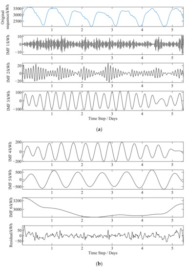 With the increasing application of data preprocessing theories such as wavelet transform, empirical mode decomposition (EMD) [9,10], ensemble empirical mode decomposition (EEMD) [11], and variational mode decomposition (VMD) [12,13], in view of the nonlinear and non-stationary characteristics of the load sequence, the data preprocessing method is used to decompose the original sequence, and each sub-sequence is predicted separately, and the prediction result is obtained by superimposing and reconstructing. With the progress of data preprocessing methods, bus load forecasting has more processing methods, and the combined forecasting method has been developed. Combination forecasting methods can be divided into two categories. One is to weight and synthesize the forecast results of different forecasting methods to obtain the combined forecast. The forecast results are easily affected by weight distribution. The other is based on the nonlinearity of the bus load sequence non-stationary characteristics, using signal processing methods such as wavelet transform, EMD, and VMD to decompose the original sequence, separately model each sub-sequence component, and reconstruct its prediction results through superposition to obtain the combined prediction results that meet the accuracy requirements. Reference [14] uses EMD to decompose the bus load for multi-step prediction, which has achieved ideal prediction results, but EMD is prone to mode aliasing and cannot choose the number of decomposed components. VMD can find the optimal solution of the natural modal function model through repeated iterations within a limited number of times, which can effectively avoid modal aliasing and improve robustness. Reference [15] proposed four hybrid models based on four decomposition methods, EMD, VMD, wavelet packet transform, and intrinsic time-scale decomposition to forecast agricultural commodity futures prices. The results showed that VMD contributed the most in improving the forecasting ability.