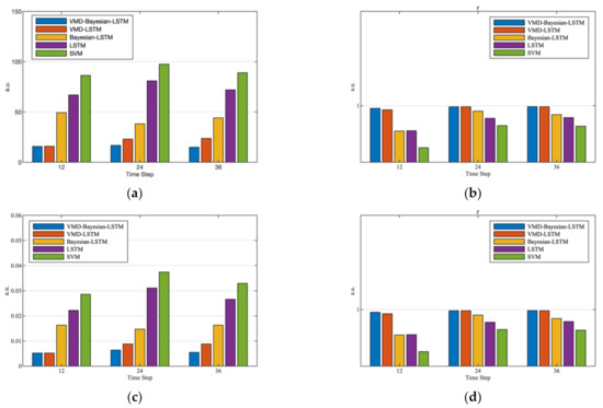 The comparison of different models shows that the prediction accuracy of each time step of LSTM is greatly improved compared with SVM. After decomposing the bus load sequence, the eRMSE, r and other indices of VMD-LSTM are greatly improved on the basis of the LSTM model, which greatly improves the prediction accuracy and stability. The comparison of VMD-Bayesian-BiLSTM and EEMD-Bayesian-BiLSTM and the comparison of VMD-Bayesian-BiLSTM and EMD-Bayesian-BiLSTM shows that the prediction error of the prediction model considering VMD in multiple time steps is lower than that of EMD and EEMD. With the proposal of Bayesian optimization theory, the eRMSE of 36 time steps of combined prediction is reduced from 23.9219 to 14.9219, the eNRMSE is reduced from 0.0088 to 0.0055, the eSTD is reduced from 20.9806 to 14.8022, and the results of LSTM are also greatly improved after Bayesian optimization. The results of the Bayesian-BiLSTM model are improved compared with those without considering Bi-LSTM. The comparison of various data shown in Figure 10 verifies that the VMD-LSTM combined prediction model based on Bayesian optimization proposed in this paper has more accurate prediction results and more stable multi-step prediction results.