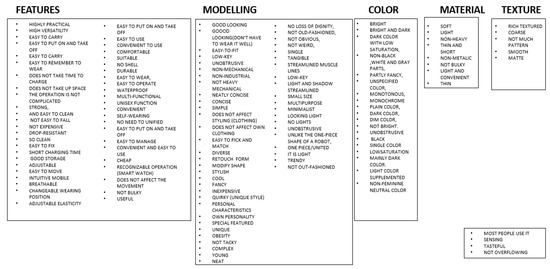 The goal of this research is to explore the influence of styling on wearing acceptance, so other influencing factors are excluded, and “Modeling” is used as a further subdivided object. The KJ method was used to classify the adjective vocabulary under “Modeling” for the second time.