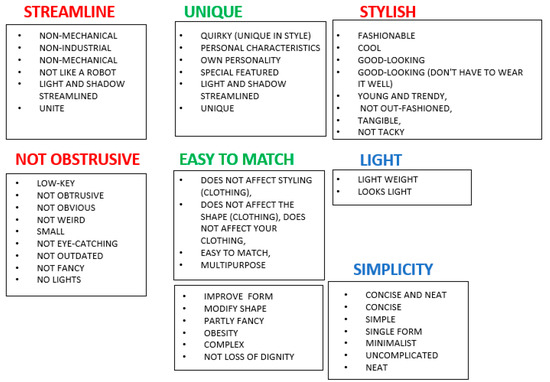 This time, the KJ method classification has seven categories: “Streamline”, “Not Obtrusive”, “Unique”, “Easy to match”, “Stylish”, “Light”, and “Simplicity”, and a small number of uncategorized vocabulary, as shown in the Figure 3 below.