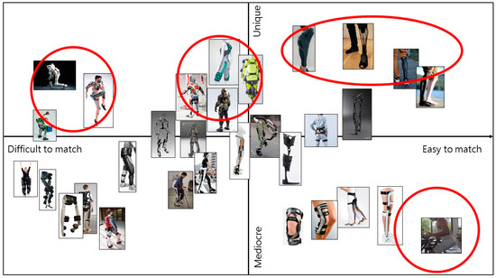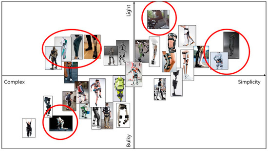 - Modeling classification of exoskeleton assistive devices: Apply the cross-analysis method to analyze the “Wearable Robotic Exoskeleton” and the “modeling adjective index” to obtain the “modeling category” of the exoskeleton assistive device;