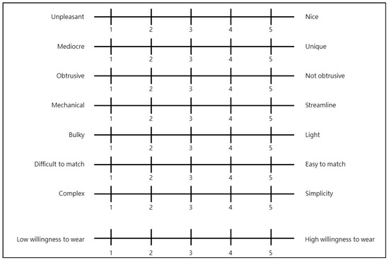 The goal of this study is to explore the relationship between the modeling of assistive devices and the acceptance of wearing. The semantic difference scale of Kansei Engineering is used for investigation and analysis. The completed scale is shown in Figure 15 below.