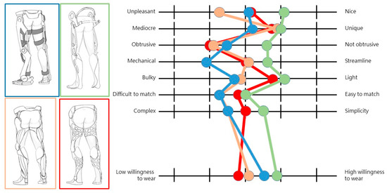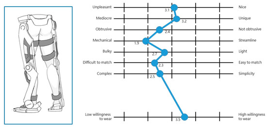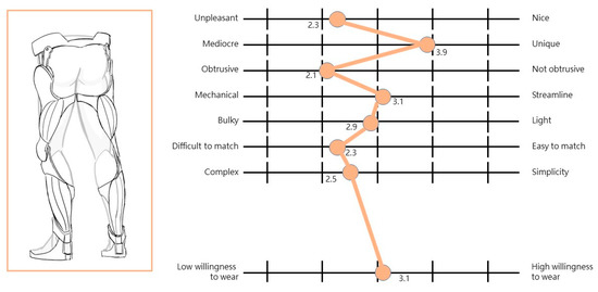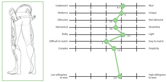 Observing the various modeling index scores and wearing acceptance of the four types of exoskeletons, it shows that all modeling indicators except for “obtrusive and unobtrusive” have no direct correlation with the wearing acceptance. Basically, the modeling indicators are only influence the presentation of style. It can be inferred that the assistive device is regarded as a part of the outfit and reducing the sense of awkwardness can increase the willingness to wear.