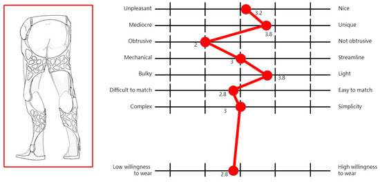 The semantic difference scale in Figure 15 is drawn based on the seven groups of modeling adjective indices obtained above, adding the degree of wearing acceptance.