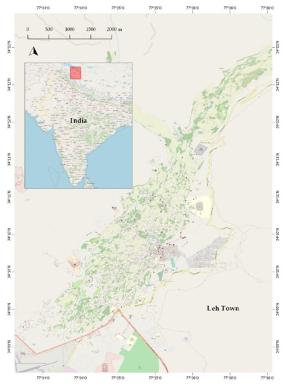 - © Openstreetmap Contributors. Cc-By-Sa. Basemap of Leh Town, Ladakh, India; QuickMapServices Qgis Plugin: 2015. Available online: https://plugins.qgis.org/plugins/quick_map_services/ (accessed on 16 September 2021).