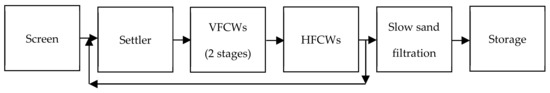 - Scenario 1: Here, a part of the town is connected to a centralized sanitation system (households and guesthouses within 20 m of the sewage canals are assumed to be serviced, as in [68]), and CWs are built for clusters of guesthouses and households. The CWs for this case were designed for treating the wastewater generated during summer (population peak) using the treatment train presented in Figure 2 [66]. This scenario was the recommended treatment scheme in terms of treatment efficiency, cost and appropriateness for weather and population fluctuations in Leh [66]: