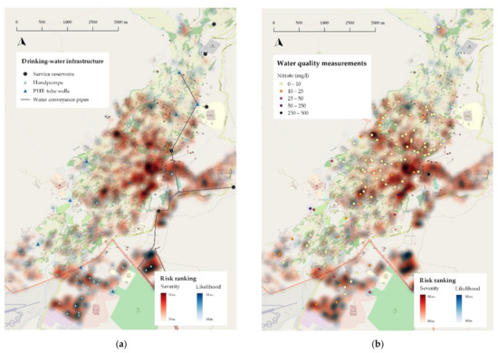 The CR-WSP methodology defines the risk associated with a hazard or hazardous event as the “combination of the likelihood of the hazard or hazardous event occurring (over some time frame) and the severity of the consequences of the hazard or hazardous event if and when it occurs” [25]. The parameters for the risk components were estimated based on literature review and spatial analysis. The maps were designed to represent the conditions of the wastewater seepage risk during the summer months, as this represents the peak in population—and wastewater production—of the town. For risk mapping, the severity was characterized as a function of the pollution load produced on-site that can seep into the ground water. Therefore, this variable depended on the volume of wastewater produced and its quality. The latter depends on the type of wastewater treatment applied. Likelihood was characterized as a function of the number of on-site sanitation facilities with a lateral distance lower than 30 m from borewells, as this increases the probability of wastewater seepage into groundwater.