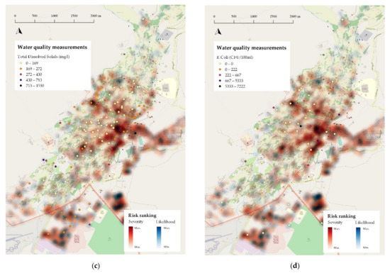 Figure 5b to Figure 5d show a comparison of the risk map with the groundwater quality measurements of nitrate, TDS and E. coli performed in 2017 by Schwaller [42]. As observed, there are about nine nitrate measurements with a concentration greater than 50 mg/L located in the center and southern part of the town that coincide with the high-risk areas mapped by the model. Although most of these points correspond to shallow groundwater measurements (from samples in handpumps with about 10 m depth), some measurements from deep groundwater (from samples in private borewells and PHE tube wells with an average depth of 33 m) also show an increased nitrate concentration. In general, increased chemical pollution values are observed in areas with a greater estimated risk of wastewater seepage. This trend is observed for nitrate, TDS and chloride measurements (the latter not shown), which indicate groundwater contamination from anthropogenic on-site sanitation systems [42].