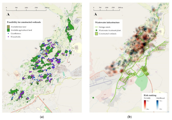 The possible available bare land was subsequently identified by defining a setback distance between the treatment system locations and all households, guesthouses, wells, rivers and reservoirs according to the guidelines defined in [82]. From this filtered bare land layer, possible bare land areas that fulfilled the following criteria were selected: they are within 50 m from each guesthouse/hotel and household, downstream from these wastewater point sources (using available digital elevation model data and contour lines) and do not cross paved roads or rivers. Then, the agricultural land nearby the identified bare land for CWs was identified to evaluate the possibility of local irrigation with reclaimed water.