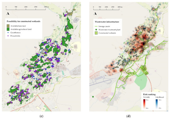 Geographic information systems (GISs) can be a valuable tool for implementing various aspects of WSPs, as they can be used to visualize possible risks and water-related information [61]. A semi-quantitative approach has been used previously for creating an overview hazard and risk assessment [61,62], monitoring of control measures and incident management [62]. In this work, GIS was used for providing a visual representation of the risk of wastewater seepage from on-site sanitation systems in Leh Town, with the objective of identifying the places where groundwater pollution may be occurring at a higher rate. The semi-quantitative risk mapping was also used for visualizing the impact of the implementation of decentralized wastewater reclamation systems—a WEF Nexus solution—using constructed wetlands for groups of hotels/guesthouses and households. The maps were drawn using the OpenStreetMap base map of Leh Town [63] and the software QGIS 2.18.21 (Las Palmas de Gran Canaria, Spain) [64].