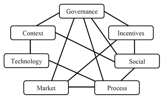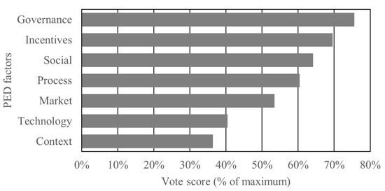 The four categories of Good and Ceseña [15]—governance, social, market and technology perspectives (see Figure 1)—also emerged in our findings and in the same rank order. This result provided a degree of confirmation and reassurance that the two methods were compatible. However, our finding highlights the importance of three other considerations, including incentives, process and context, which rank amongst the other four categories (Figure 2).