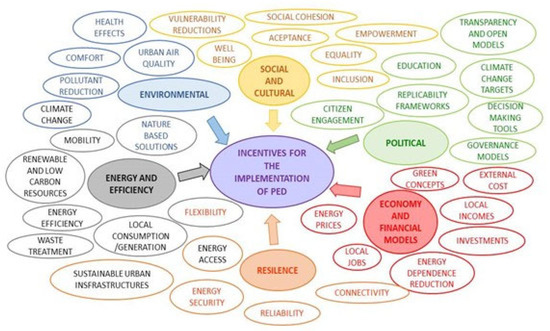 The adoption of the right incentives is a key issue to achieve PEDs. There are multiple benefits stemming from ordinances creating incentives for renewable energy, including economic, ecological and health benefits. In this regard, local governments have a variety of options for creating incentives to support or subsidize the installation of renewable energy equipment, including offering rebates on purchasing equipment, tax incentives, expedited permitting and others [20]. Incentives can also be used by the private sector to encourage cities, housing associations, households and companies to implement PEDs. The outcome of incentives can be focused on supporting increased deployment of targeted technologies and practices, environmental gains, livability and inclusiveness in districts. As Figure 3 represents, incentives can create additional local jobs in energy business, improving air quality, benefitting public health and preventing energy poverty [20,21].