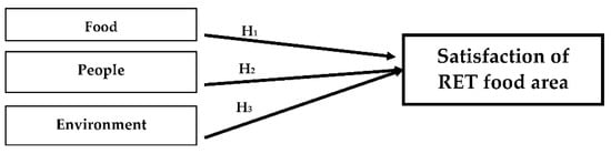 Food safety attributes are parts of customer experience. Service performance may positively influence overall satisfaction. A restaurant’s physical environment, such as the cleanliness of the service area, restrooms, and lighting, are associated with customers’ emotional responses and satisfaction [,]. Wall and Berry suggested functional, mechanic, and human-related factors to assess restaurant cleanliness and evaluate customers’ restaurant experience []. These three factors were critical to ensuring customer satisfaction and business sustainability. Liu and Lee investigated the relationship between food safety-related factors, overall satisfaction, and revisit intention []. The attributes of RTE food safety and the performance of RET food at hypermarkets encompass the food-, physical environment-, and people-related dimensions. Based on the preceding discussion, the following scheme (Figure 1) and hypotheses were considered: