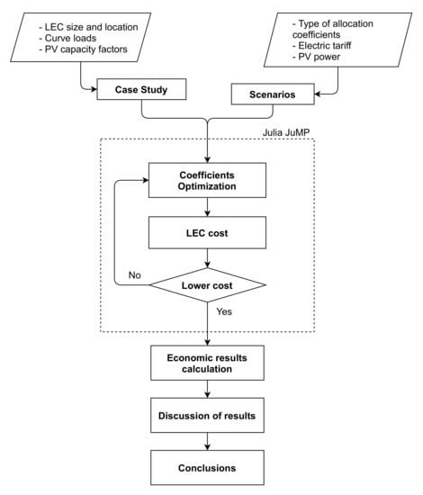 This section presents the methodology used in this paper. To answer the research questions, we model a LEC to simulate and optimise its performance. A scheme of the method followed is presented in Figure 1, which results in a Linear Problem due to the specific physical and economic objective and constraints of the optimisation.