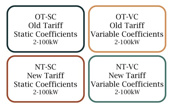 To assess the impact of the new tariff regulation and the use of different allocation coefficients, we have defined 200 scenarios. These scenarios are defined based on the variables and values indicated in Table 2. The PV installation for the LEC will be assayed for values from 0 kW to 100 kW in steps of 2 kW. The maximum 100 kW is related to the maximum power capacity allowed in the legislation to use the simplified selling mode []. This way we will be able to evaluate the impact of the changes in tariff and coefficients for different relations among consumption and generation.