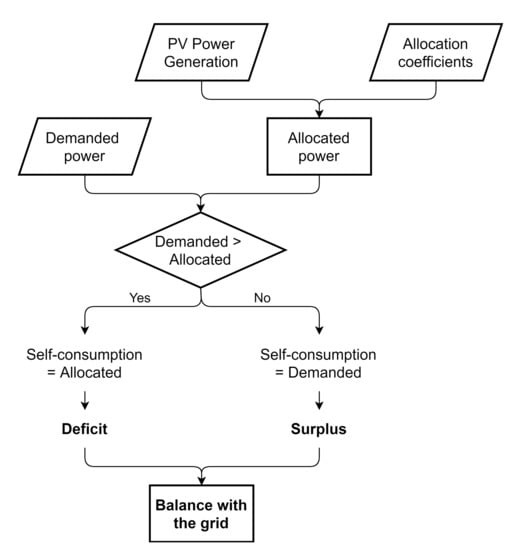 Thus, for each scenario allocation coefficients are optimised. For that, we use the modelling language for mathematical optimisation JuMP, embedded in Julia []. When the scenario involves static coefficients, the best set of coefficients is obtained for all the hours of the year while, if the scenario employs variable coefficients, the best set of coefficients is optimised for each hour of the year. To establish which is the best set of coefficients we measure the cost of electricity for the LEC. To do that, the process on Figure 3 is followed. Thus, on each hour the allocated power to each user is compared with their demand to evaluate if all demand can be supplied by the allocated power. Furthermore, if some surplus is generated or only a part of the demand is self-consumed and there is a power deficit. In any case, this generated deficit or surplus is balanced with the grid buying or selling power, respectively. This will ultimately determine the cost of electricity for the LEC giving us an objective metric to compare scenarios. Hence, for each scenario, we obtain independent results that are assessed and compared in the discussion of results. Once we have processed all the scenarios and have discussed the results, conclusions are drawn.