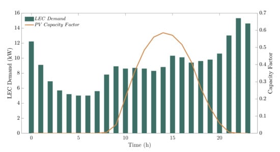 LEC demand and PV capacity factor on an average day for the case study.