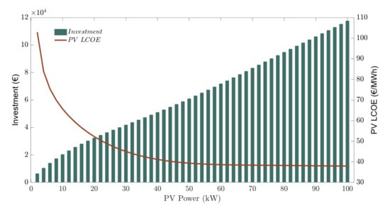 Figure 5 shows the PV investment required according to the power installed and the LCOE. Results show that investment rises with installed power while the cost of energy decreases, this implies that the energy produced grows faster than the investment required. Nonetheless, this effect is seen especially for reduced installed power and for big installed power the scale economy effect has very little impact.