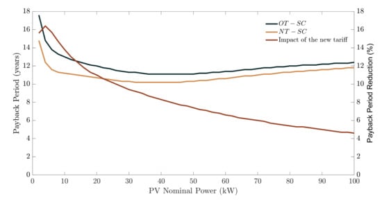 The change in tariff regulation has an economic impact even if the LEC sharing process is the same. Figure 7 shows how the payback period changes based on the PV installation nominal power employing current static allocation coefficients for the old and the new tariff regulation. The impact indicated in the figure is calculated as the relative change of the value obtained with the new tariff with the corresponding value of the old tariff. These results indicate that the new tariff improves the economic performance of the LEC. This positive impact is very relevant to evaluate the convenience of the new tariff to promote local energy communities in Spain.