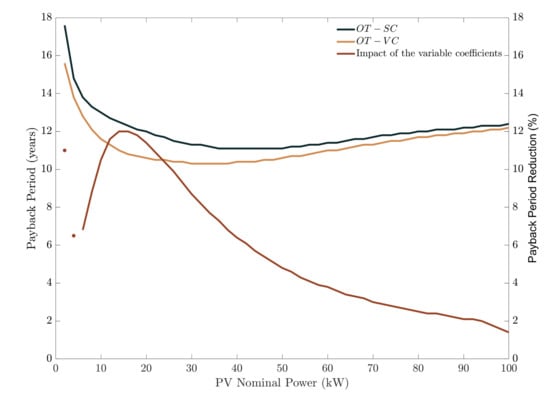 Payback period in relation to the nominal PV power installed using the old tariff using static and variable coefficients. The impact of employing variable coefficients is also shown.