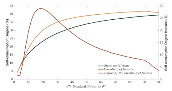 Self-consumption degree in relation to the nominal PV power installed employing static and variable coefficients.