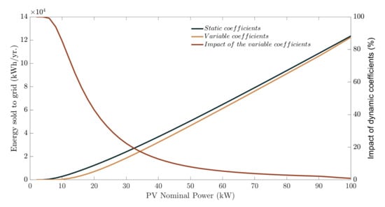 Sold energy to the grid in relation to the nominal PV power installed employing static and variable coefficients.