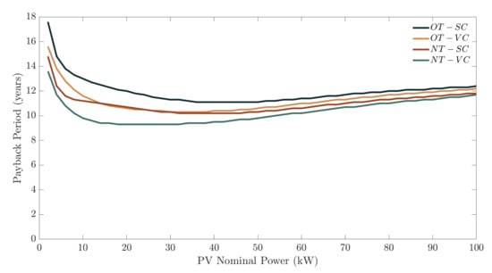 Payback period in relation to the nominal PV power installed applying static and variable coefficients under the old and new regulations.