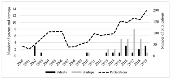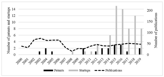 We analyse the knowledge bases of AI technology in both cities. To do this, we use a bibliometric analysis of secondary data. Academic publications serve as a proxy for the emerging knowledge, patents as a proxy for realised knowledge, and startup data as a proxy for experimental knowledge [18]. In other words, these three actors’ practices are captured through their actions regarding publications, patents, and entrepreneurial activities [38,39,40,41].
