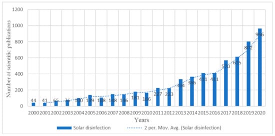 The past few years witnessed the development of many cost-effective and proper water treatment technologies, using sustainable and eco-friendly principals instead of chemical treatment processes [3]. Conventional SODIS has been used in many isolated regions in Africa and south-east Asia as a household water treatment method [3,4]. The utilization of solar power in water treatment has recently gained tremendous attention due to its accessibility, cost-effectiveness, and availability in most undeveloped countries. Despite the effectiveness and low costs of the most currently applied water treatment approaches such as ozonation, chlorination, and advanced oxidation processes they have major drawbacks including the generation of potential harmful byproducts, decomposition of organic pollutants, and/or inactivation instead of killing of water pathogenic microorganisms [5,6,7,8]. Different approaches have been used for solar disinfection, such as the filling of transparent polyethylene bottles with untreated water and then exposing them to sunlight for variable time, depending on the climate [9]. This simple procedure was found to be sufficient for killing the bacteria and other water microorganisms and considered a successful approach in different regions with illuminated periods such as Cameroon, India, Senegal, and South Africa [10]. However, conventional SODIS technology has been associated with several drawbacks, including the small and limited volume of water bottles, as efficiency of the process mainly depends on various factors including the initial level of water contamination, solar irradiance, water turbidity, time of day, and the atmospheric conditions [11]. The required time for some microbial inactivation was reviewed recently by Malato et al. [12] and reported to range from 20 min to 8 h depending on the microbe. The long period of time and unavailable direct solar power on some days are some of the known limitations of the SODIS process. However, great advances have been made in this field to enhance efficiency and overcome such issues, which can be observed from the marked accelerated increase of the number of publications each year regarding the utilization of solar disinfection of water as presented in Figure 1.