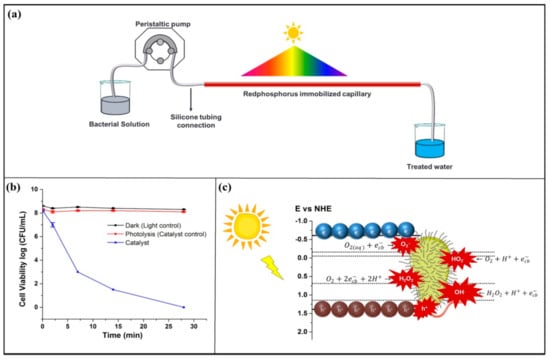 Schematic illustrations of continuous-flow solar photocatalytic disinfection: (a) the overall disinfection process, (b) cell viability, and (c) the mechanism of photocatalytic disinfection. Adapted from Roshith et al. [133].