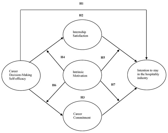 Internships are gateways from the classroom to the real world, and provide inexperienced students with chances to examine their abilities, interests, and career decisions in a workplace context [1,2]. With regard to students in hospitality management departments, internships are not only essential for their university studies, but also a reliable way to gain their first jobs. A successful internship can encourage students to focus their careers plans on the hospitality industry [3,4,5]. In addition, self-efficacy refers to an individual’s belief in their capabilities to mobilize the cognitive resources and motivation needed to achieve a certain action or carry out specific tasks [6,7,8,9,10]. On the basis of Bandura’s [11] social cognitive theory, higher self-efficacy enhances motivation, cognition, and emotion in relation to the learning process. Although self-efficacy has been widely applied to different domains of career assessment, one of the key applications is in the concept of career decision-making self-efficacy [12]. Career decision-making self-efficacy refers to a person’s degree of confidence about their capability to make career decisions successfully [13,14,15,16]. Furthermore, Betz et al. [12] proposed that career decision-making self-efficacy is composed of five competencies: accurate self-appraisal, goal selection, gathering occupational information, problem-solving, and making plans for the future. In other words, students in internships who have high career decision-making self-efficacy will make more effort regarding the decision process, persist in finding solutions for the problems they face, and engage more actively in career development efforts [17]. Most important of all, these qualities can help to increase their intention to remain in the hospitality industry after their internship has been completed. In addition, when students feel satisfied with internships due to factors such as promotion, payment, leadership, co-workers, and the job itself, they have a great propensity to pursue the same career and make more effort in doing so [18,19]. Similarly, career commitment refers to the commitment a person feels with regard to their work [20], and can also influence their intention to remain in the same industry. Though previous studies have investigated the single relationship between internship satisfaction, career commitment, career decision-making self-efficacy, and intention to stay in the hospitality industry [3,21,22,23,24,25], there is still a lack of an integrative perspective to discover the causal linkages among the aforementioned variables. Therefore, the first question that the research aims to answer is whether internship satisfaction and career commitment in the proposed model could mediate the relationship between students’ career decision-making self-efficacy and their intention to stay in the hospitality industry, thus filling the research gap or missing pieces in the research of hospitality literature.