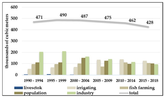 After 2000, there is a general downward trend in the volumes of water taken due to the low demand from industry amid a rather sharp economic decline in the region (from 210 million m3 in 1995–1999 to less than 110 million m3 in 2015–2018). At the same time, there was a strong migration of the population from this region to other regions in Romania or Europe, with the effect of reducing the volumes of water taken to supply water to the population, in parallel with the expansion of water supply networks in urban areas but especially in peri-urban and rural areas. These water supply networks, fed from groundwater or surface water resources from adjacent drainage basins to this region, located in the western part beyond the Siret river, had the effect of reducing the volumes of water taken directly to supply the population with water resources in this region (from 151 million m3 in 2000–2004 to 102 million m3 in 2015–2018). However, 50% of the population of this region continues to be fed directly through individual wells [47], with an effect on the volumes of water taken.