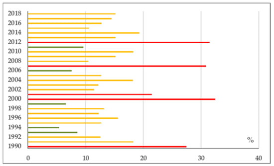 If the values are between 10% and 20%, the water resources are considered subjected to reduced anthropogenic pressure, and values of the exploitation index between 20% and 40% indicate the existence of high anthropogenic pressure on the water resources. WEI values of over 40% indicate the existence of extreme pressure on water resources, with devastating impacts in the medium and long term. From the data transmitted between 1990 and 2016 by Romania to Eurostat, an index of the entire country was calculated. By applying WEI + (at the river basin level), the anthropogenic pressure on water resources in the entire eastern part of Romania for the period of 1990–2018 was estimated. The data used refers to the average annual volumes transported by the main rivers in the region and the estimated volumes at the level of groundwater bodies were provided by the Water Basin Prut-Barlad Branch.